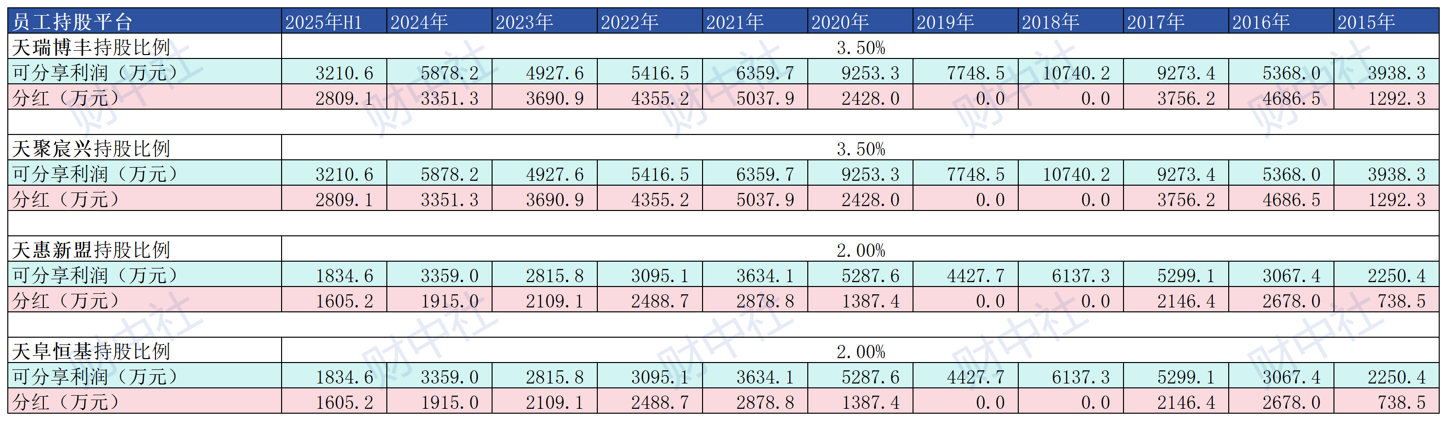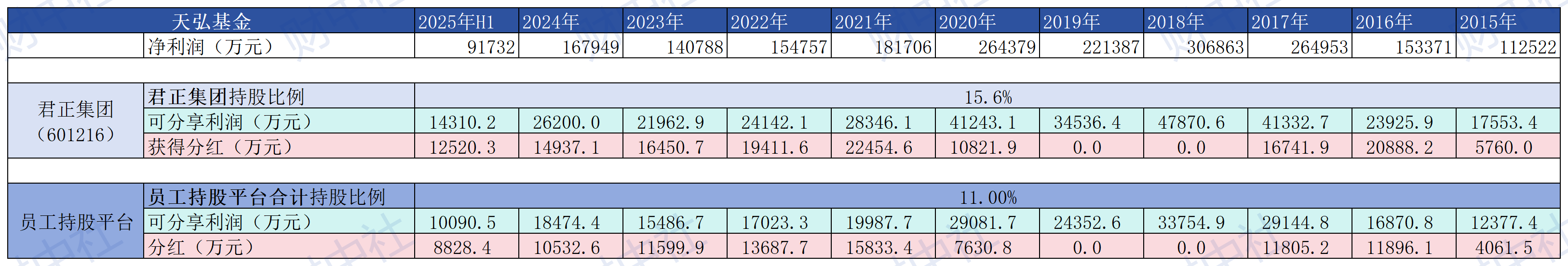 十年间,员工持股平台的分红回报已相当可观。《财中社》统计的数据显示,天弘基金四个员工持股平台累计分红近9.6亿元……其中郭树强累计获得分红达20173万元,仅2025年上半年便有2003万元入账,而这仅为分红金额,若按照可分得利润计算,该金额则高达48714万元。