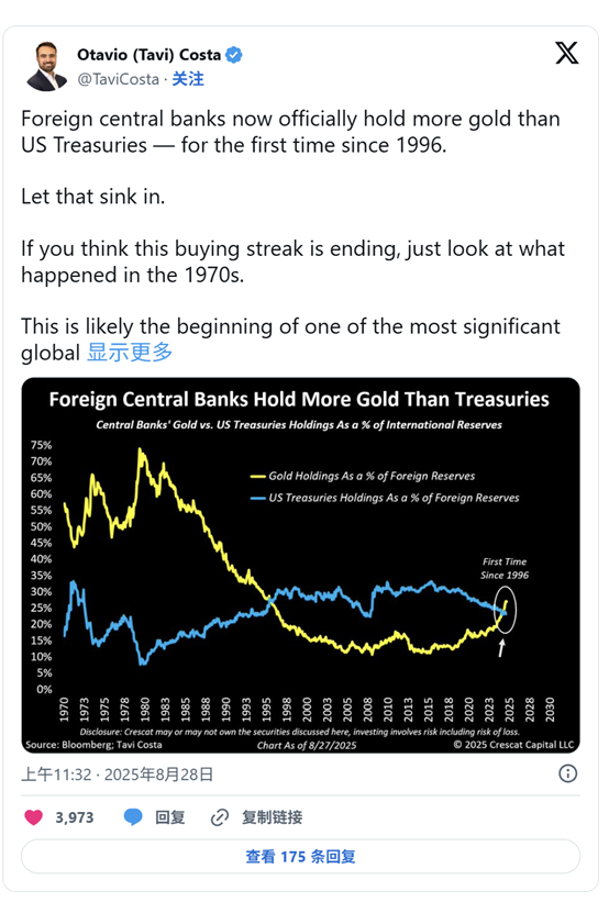 根据Crescat Capital合伙人兼宏观策略师Tavi Costa汇编并发布在X上的数据,在金价创下新纪录之际,外国央行的黄金持有量自1996年以来首次超过美国国债。