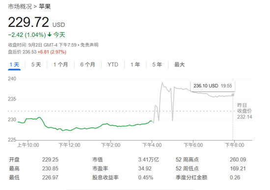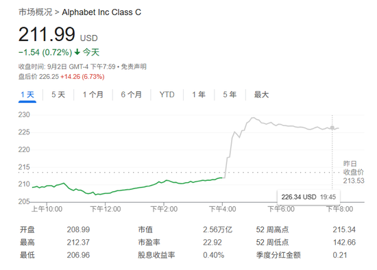 判决公布后,谷歌母公司Alphabet股价在盘后交易上涨近7%,市值一夜之间增加近2000亿美元;苹果股价也因保住与谷歌的默认搜索合作上涨接近3%。这意味着,投资者显然将这一结果视为对谷歌的“低成本处罚”。
