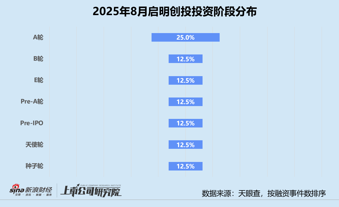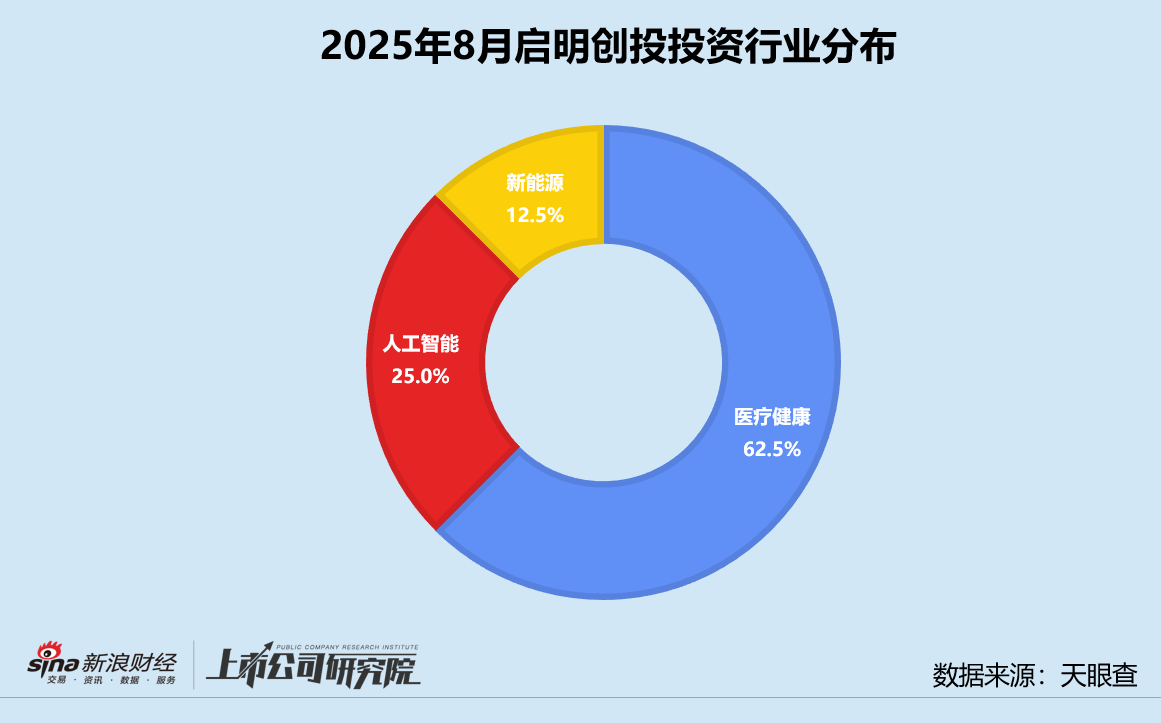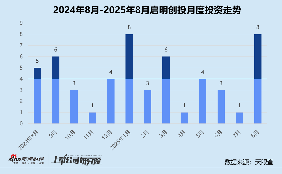 除了高调入主上市公司,统计区间内,启明创 *** 开披露的股权投资事件共8起,较2024年8月显著增长60.0%,与2025年7月相比翻了8倍。结合往期数据分析,启明创投的投资活跃度呈现“脉冲式”特征,2024年11月、2025年4月和7月探底,在市场环境阶段性趋冷的情况下,其调整投资节奏;2025年1月和8月冲高,投资事件数双双达到8起,或是为捕捉医疗健康、人工智能等赛道窗口期。