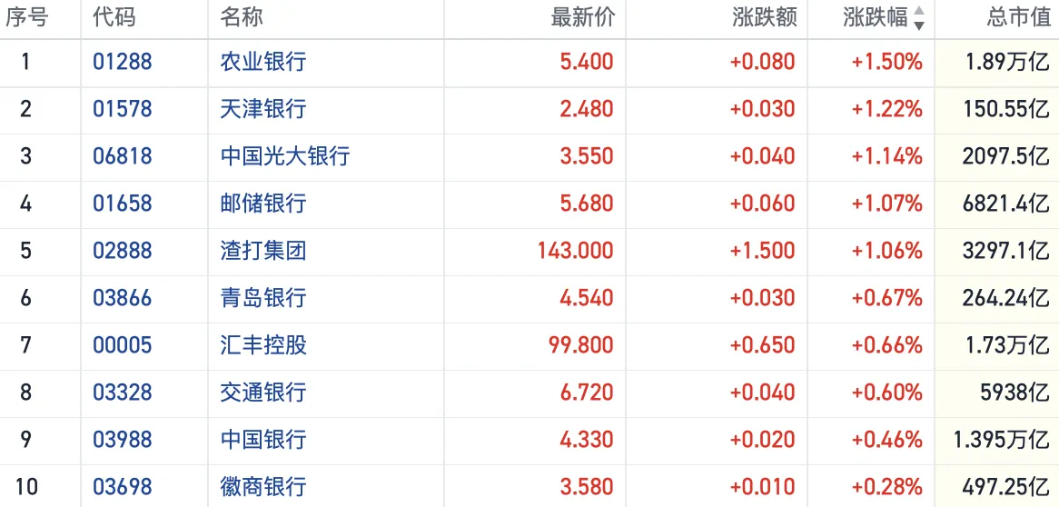 内银股今日午后探底回升,引发市场关注。截至发稿,(01288.HK)、(01658.HK)均涨逾1%,(03988.HK)、(01398.HK)等国有大行也集体跟涨。