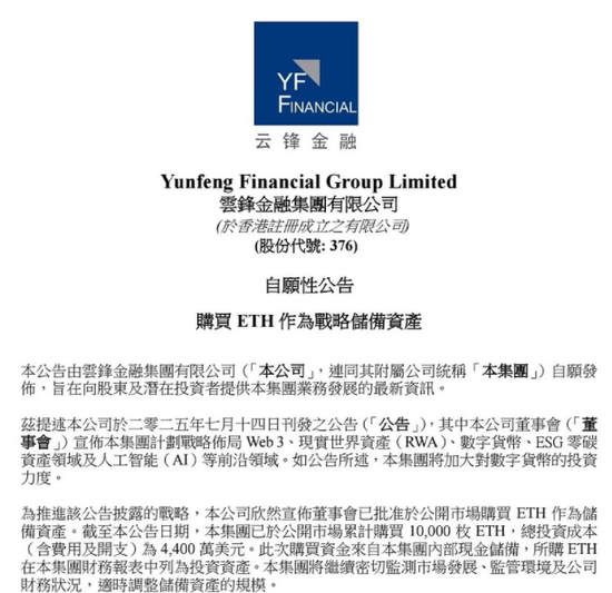 更值得注意的是,本次以太坊购入经由HashKey Exchange完成,而云锋金融的独立非执行董事肖风,恰为HashKey集团的核心人物,也显示出云锋金融此次行动远不止于资产配置,更可视为对香港合规数字资产生态的整体认可与战略支持。