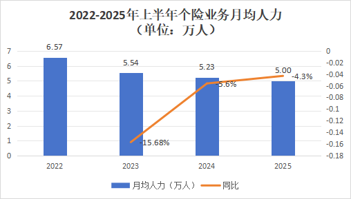 2025年上半年,中国人保个险渠道营销员数量及月均有效人力相较去年同期略有下降。