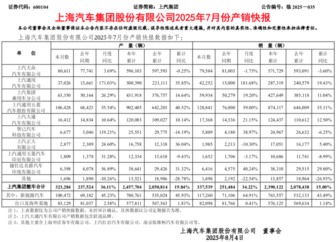8月4日,对外发布2025年7月以及1-7月销量快报。数据显示,2025年7月,上汽集团整车合计销量为337539辆,同比增长34.22%,今年前7月累计销量为2390122辆,同比增长15.00%。其中,7月新能源汽车销量为117260辆,同比增长64.91%,今年前7月累计销量为763557辆,同比增长43.49%。此外,7月出口汽车为82098辆,同比增长0.41%,前7月累计销量为576125辆,同比增长1.14%。