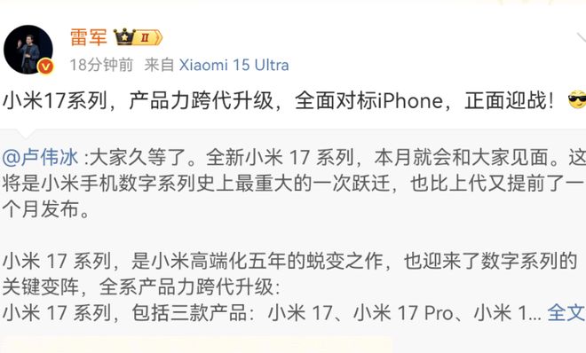 雷军也转发了卢伟冰的微博,并表示小米17系列全面对标iPhone。