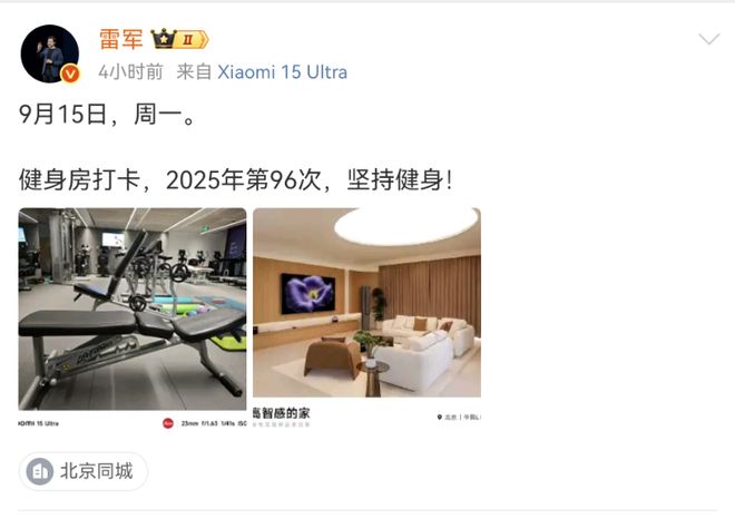 此外,今天雷军还宣布2025年健身96次,距离满100次还剩4次。