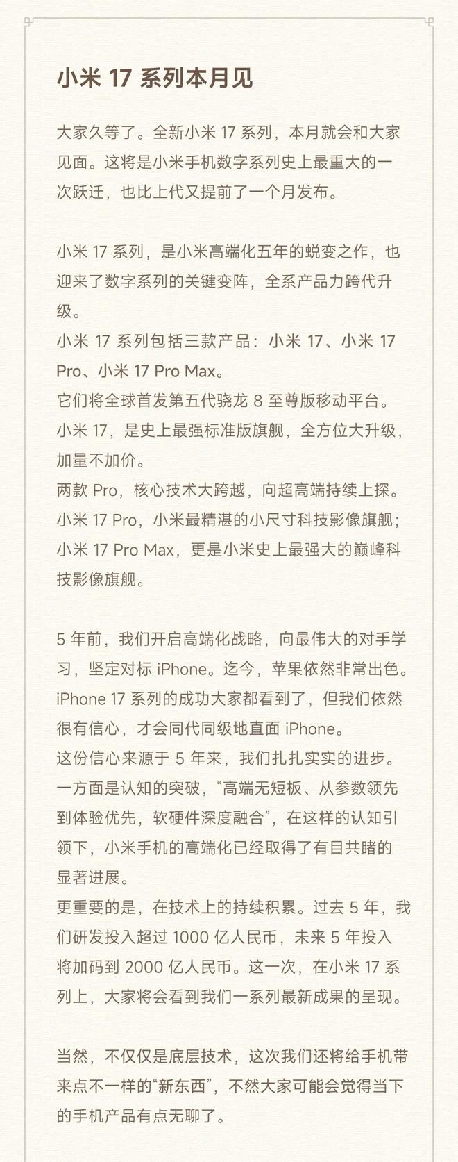 9月15日,小米集团合伙人卢伟冰发宣布小米17系列手机本月即将发布,包括小米17、小米17Pro和小米17ProMax三款产品。