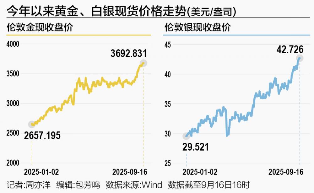黄金价格再创新高。9月16日,亚洲时段(截至北京时间18点),黄金更高触及3697.7美元/盎司,再度刷新历史新高。与此同时,白银也跟着上冲至42.77美元/盎司,也刷新了近14年来的高点。