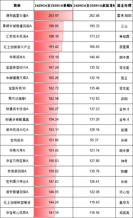 9月17日消息,A股“924行情”一周年之际,数据显示,从2024年9月24日至2025年9月16日,德邦鑫星价值A涨幅263.97%位居灵活配置基金之一名,景顺长城稳健回报A涨幅199.85%位居灵活配置基金第二名,汇安成长优选A涨幅198.18%位居灵活配置基金第三名。