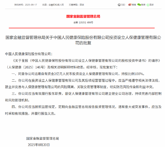 9月17日金融一线消息,国家金融监督管理总局今日发布关于中国人民健康保险股份有限公司投资设立人保健康管理有限公司的批复,同意中国人民健康保险股份有限公司运用自有资金2亿元人民币投资设立人保健康管理有限公司,持股比例100%。