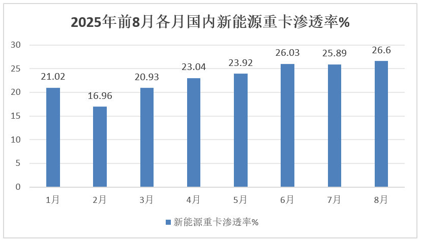 根据上述数据可知,2025年8月国内新能源重卡占据国内重卡大盘26.6%的份额,也就是说2025年8月我国新能源重卡市场渗透率达到26.6%。从2025年前8月各月国内新能源重卡市场渗透率来看,2025年8月的渗透率创下今年新高。