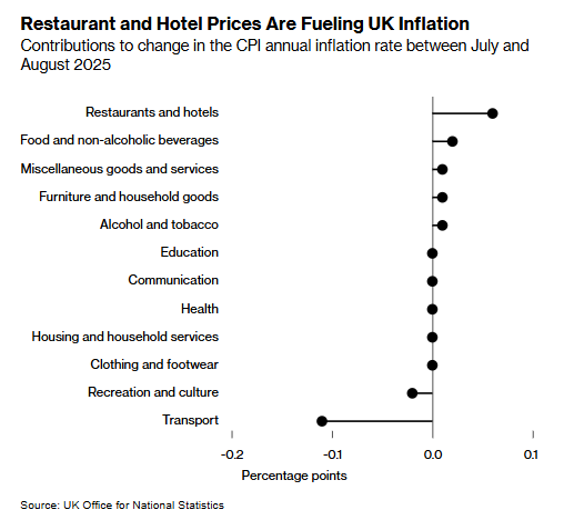 另有更多迹象表明,英国工党今年4月上调薪资税及更低工资标准后,企业正将由此增加的成本转嫁给消费者。英国国家统计局数据显示,餐饮及酒店价格同比上涨3.8%,创下2024年11月(即工党宣布上调就业税后不久)以来的最快涨幅。