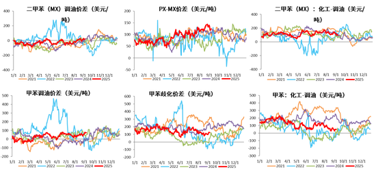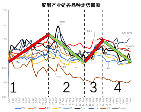 第二阶段(7月26日至8月14日):交易所出台风控措施,反内卷题材炒作降温。龙头品种及广期所品种价格回落,带动聚酯产业链品种下跌。而聚酯产业链上游品种MX、石脑油和汽油紧跟原油价格走势,受国内因素影响较小,见顶节奏稍晚。