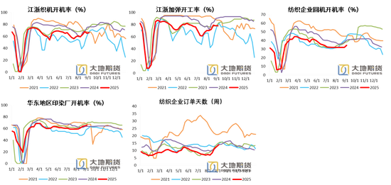 进入三季度,关税冲突影响逐渐淡化,随着旺季临近,纺织企业订单天数大幅增加,织机、加弹、圆机和印染开机率见底回升。