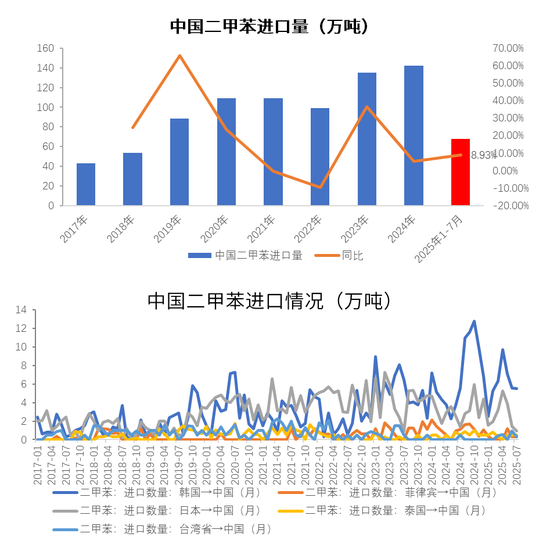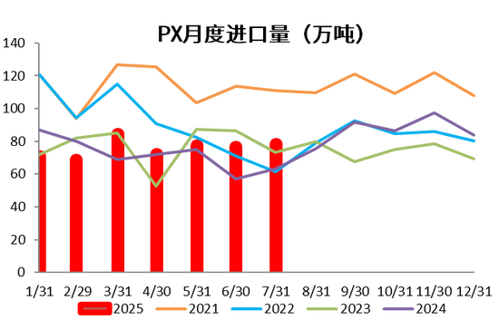 2025年1-7月我国累计进口PX数量为528.2万吨,同比+5.1%,7月份进口78.2万吨,环比+2.2%,同比+23.7%。