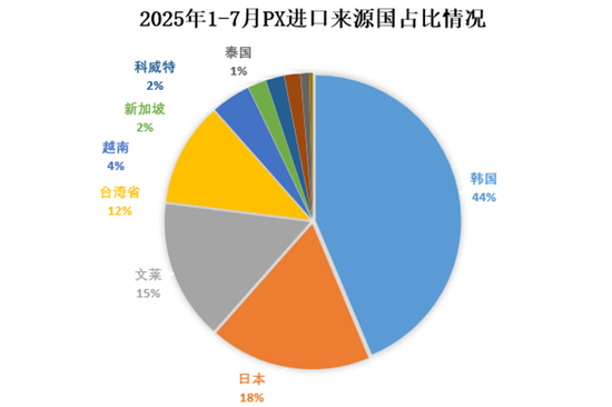 1-7月份PX累计同比增速在上个月由负转正。PX进口来源总共有11个国家或地区,其中排名前五占比达到93%,分别为韩国(230.7万吨,43.7%)、日本(94.3万吨,17.8%)、文莱(81.8万吨,15.5%)、台湾省(60.7万吨,11.5%)和越南(23.1万吨,4.4%)。
