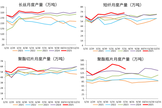 2025年8月1日起,国内大陆地区聚酯产能在8894万吨,其中直纺长丝产能在4378万吨,短纤在984.5万吨,瓶片在2168万吨。