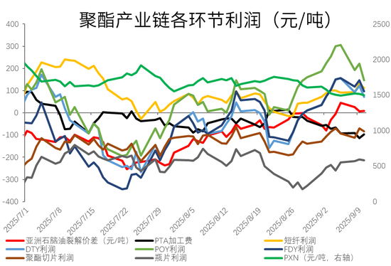 第四阶段(8月27日至今):股市回调,商品做多风险偏好下降,反内卷落地周期较长,进入交割月,预期定价权重下降,市场关注商品现实供需。聚酯旺季成色一般,成本表现偏弱,PX、PTA以及下游聚酯品种价格回落,其中MEG新装置投产,价格回调更为明显。