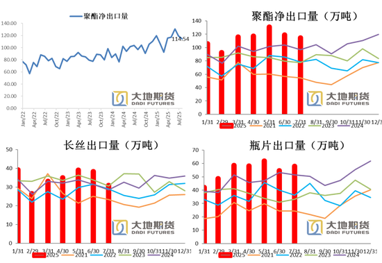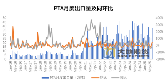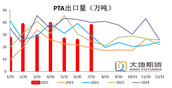 2025年1-7月PTA出口量为223.1万吨,同比-15.3%。7月份PTA出口量37.4万吨,环比+46.7%,同比-6.5%。
