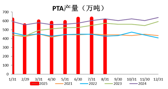 2025年1-8月,PTA产量4811.4万吨,同比增加165.37万吨,增幅4.08%。