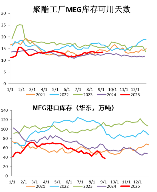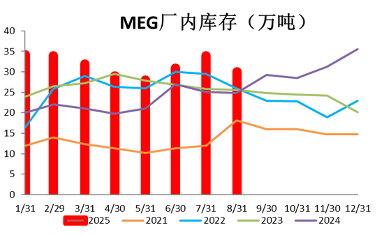 综合考虑厂家库存、聚酯厂家库存以及港口库存,MEG库存绝对水平并不高。