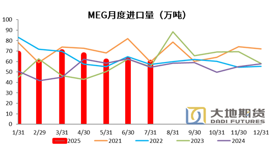 2025年1-7月份,我国进口MEG总量为443.7万吨,同比增加18.2%。7月MEG进口59.1万吨,环比-4.3%,同比+8.4%