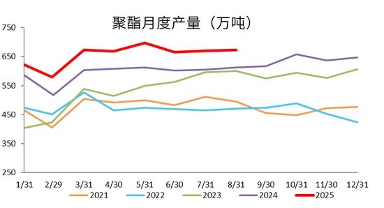 需求方面,内需方面, *** 从多维度发力促进国内消费,我国1-7月社零总额同比增4.8%,表明促消费政策取得一定成效,对我国纺织品服装消费形成支撑,1-8月纺服销售额累计同比+2.9%,表现出较强的韧性。假设接下来中美两国谈判进展顺利,当前关税税率维持现状,美联储开启降息周期,流动性持续转宽松,批发商将存在补库的可能性,进而支撑国内纺织品服装的出口,我们对国内纺织品服装的消费前景持乐观态度。分阶段看,三季度纺服消费旺季,聚酯负荷维持高位,四季度终端订单转弱,聚酯负荷小幅下行,需求先强而后弱。