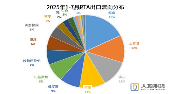 从出口流向来看,2025年1-7月份PTA出口排在前五的分别是越南(39.7万吨,17.8%)、土耳其(27.1万吨,12.1%)、埃及(26.1万吨,11.7%)、阿曼(24.2万吨,10.8%)和俄罗斯(19.1万吨,8.6%)。7月单月数据看,土耳其和印度增加,7月出口至土耳其数量增加7.5万吨,出口至印度数量增加5万吨;我国出口至多个地区的数量出现减量,7月对埃及出口PTA下降4.2万吨,对巴基斯坦出口下降3.5万吨,对孟加拉国出口下降1.2万吨。