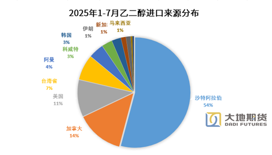 2025年1-7月,我国乙二醇进口主要集中于沙特、加拿大、美国、台湾、阿曼、科威特和韩国六个国家或地区,占比超过90%,其中沙特占比更高,达到54%。沙特依然是国内最主要的乙二醇进口来源国,1-7月我国累计从沙特进口乙二醇239.1万吨。7月底沙特产能分别为45、45、70万吨/年的几套乙二醇装置重启,预计未来两月我国乙二醇进口数量有增加预期。