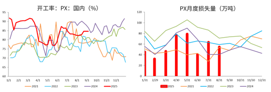 6月份二季度检修的装置陆续重启,进入三季度,PX装置负荷整体维持平稳。7月份,计划外只有盛虹炼化装置前端故障下滑,其他装置变化不大。8月份,富海检修重启,盛虹装置恢复,加上国内几套重整装置投产,PX潜在供应增加。