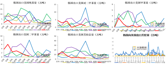 2025年1-7月,韩国向美国出口的芳烃总量为44.9万吨,同比-63.2%。其中纯苯3月份之后向美国出口量降至0,其他芳烃如*、甲苯和出口量相对往年同期大幅下滑,纯苯累计同比-89.6%,甲苯累计同比-75.6%,*累计同比-39.1%,*累计同比-18.5%。