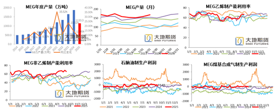 2025 年预计新投产的装置还有2套,分别是宁夏鲲鹏20万吨,已在试车中,裕龙石化80万吨待投产,10月份共有100万吨的投产兑现。2026年,总共有四套装置投产,以油制为主,总共270万吨,MEG明年投产增速回升至5.56%。