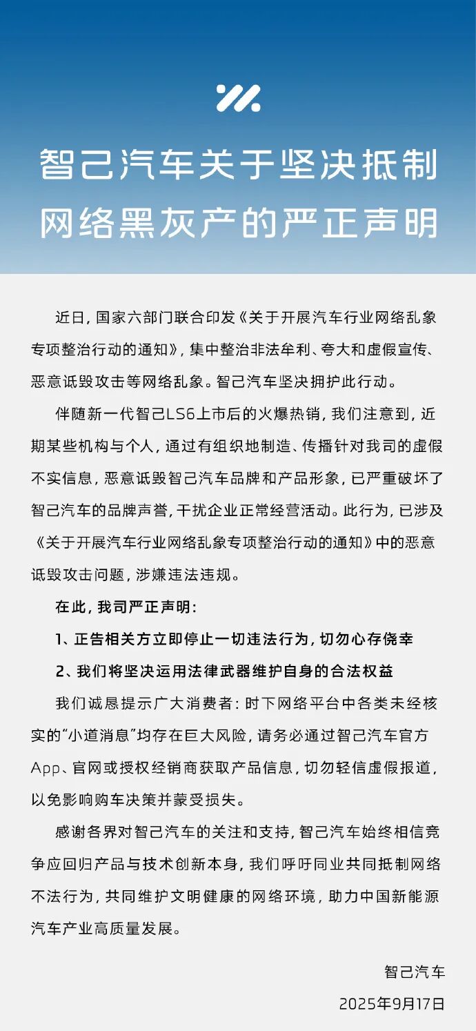9月17日,智己汽车发布《关于坚决 *** *** 黑灰产的严正声明》。声明内容显示,伴随新一代智己LS6上市后的火爆热销,智己汽车注意到,近期某些机构与个人,通过有组织地制造、传播针对智己汽车的虚假不实信息,恶意诋毁智己汽车品牌和产品形象,已严重破坏了智己汽车的品牌声誉,干扰企业正常经营活动。