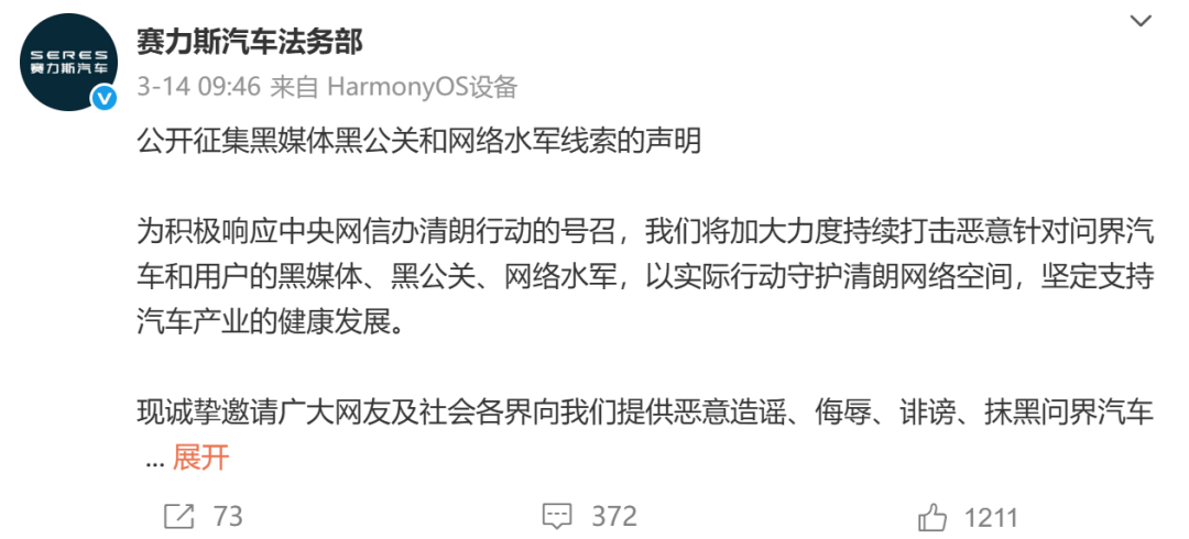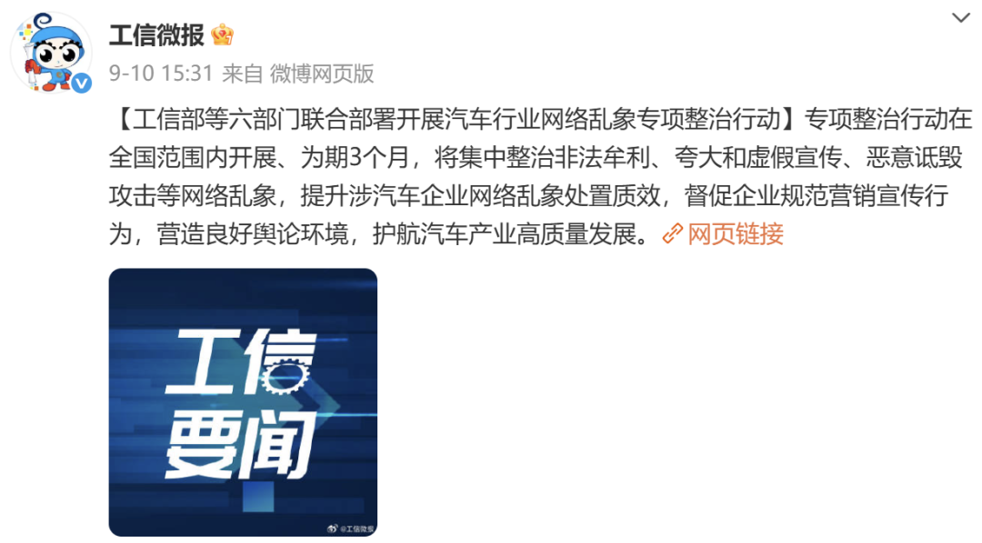 除此之外,为整治非法牟利、夸大和虚假宣传、恶意诋毁攻击等 *** 乱象,工业和信息化部等六部门也重拳出手整治。9月10日,工业和信息化部、中央社会工作部、中央网信办、国家发展改革委、公安部、市场监管总局等六部门联合印发了《关于开展汽车行业 *** 乱象专项整治行动的通知》,决定在全国范围内开展为期3个月的专项整治行动。在国家部委下场整治后,包括鸿蒙智行、理想汽车、蔚来、小鹏汽车、极氪汽车、岚图汽车等多家车企法务部均先后发布了一系列 *** 黑公关账号。