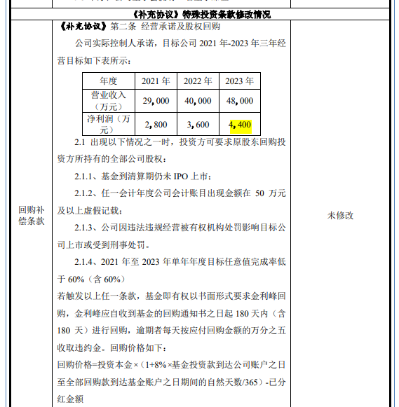 苦守三年多以后,原有机构于今年4月清仓退出,几乎同时,新进投资方与实控人金利峰签下对赌协议,约定公司上市申请需在2025年6月底前获得受理并于2027年6月底前成功上市,否则将触发回购。