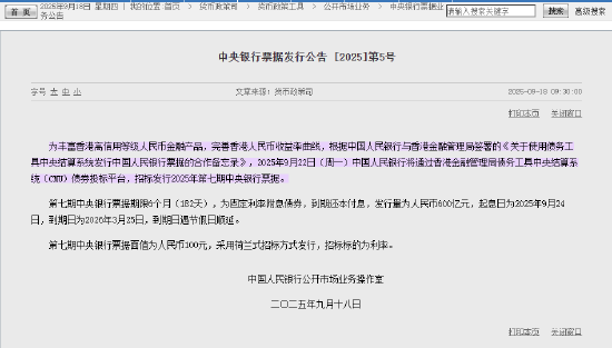 9月18日金融一线消息,2025年9月22日(周一)中国人民银行将通过香港金融管理局债务工具中央结算系统(CMU)债券投标平台,招标发行2025年第七期中央银行票据。第七期中央银行票据期限6个月(182天),为固定利率附息债券,到期还本付息,发行量为人民币600亿元,起息日为2025年9月24日,到期日为2026年3月25日,到期日遇节假日顺延。第七期中央银行票据面值为人民币100元,采用荷兰式招标方式发行,招标标的为利率。