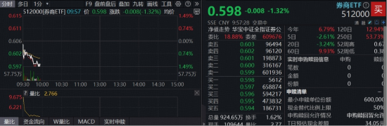 9月18日早盘,券商板块走弱,个股集体回调,截至发稿,跌逾5%,、、跌超4%;权重股方面,跌近3%,、微跌。300亿顶流券商ETF(512000)场内价格现跌1.32%,开盘不足半小时实时成交额超5亿元,交投活跃。