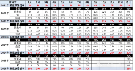 从2019-2021年,整个新能源商用车的渗透率在3%左右水平,2022年达到9%,2023年达到11%,2024年全年达到20%,2025年1-8月就达到渗透率25%的良好水平,体现了新能源商用车强势增长良好态势。2025年8月商用车新能源渗透率30%,其中的卡车新能源渗透率23%,客车新能源渗透率63%,较同期均有大幅提升。