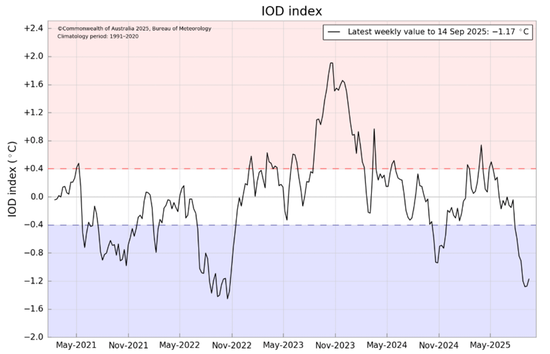 印度洋偶极子的负相位会导致棕榈油产区出现降水过多的问题,在22年的时候当时的印度洋气候系统导致了产区降水的整体偏多,对产量造成了一定的影响,不过当时产区还叠加了“拉尼娜”导致的降水增加,因此是一个综合性作用的结果。