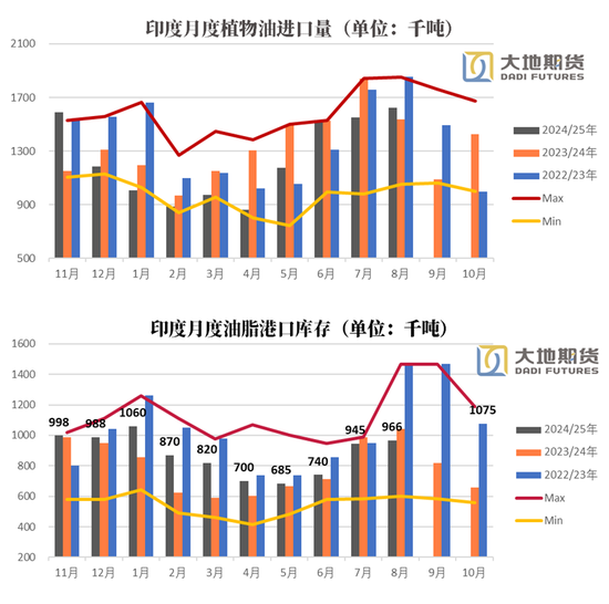 从库存的角度看,今年的港口累库情况和去年比较类似,但实际的进口节奏和去年有着非常大的区别:去年9月由于受到印度 *** 对进口油脂增加关税的影响,导致去年9月印度油脂进口量环比下降了30%,并且在低库存的情况下出现了旺季需求后置的现象,对比进口数据也可以看到2024年的10—11月也因此出现了一个进口高峰。