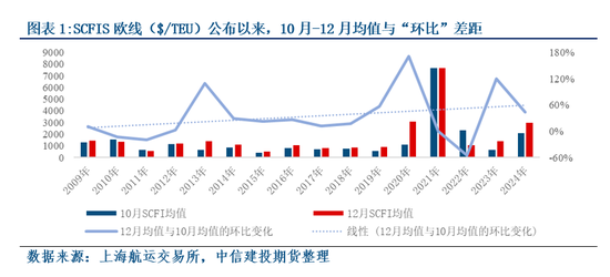 之一点,历史数据来看:传统旺季12月和淡季10月的运费差距往往有限,大致在3~4成。需要明确的黑天鹅事件方能显著偏离历史水平,如2020年下半年的疫情冲击(供应链危机-供给收紧而需求因欧美 *** 政策快速扩张)与2023年末的红海供应链冲击。2024年则可直接参考期货交割结算价,10月合约与12合约差距约为44%。