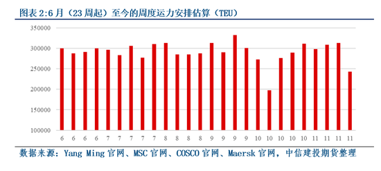 核心矛盾在于,当前船期安排下,传统淡季的10~11月存在数周周度运力在29~32W TEU区间,若市场认为夏季运力便属于相对高位,从而会抑制运价上行可能,则当前淡季的高运力(类似夏季)安排是否会抑制运价止跌企稳的可能呢?