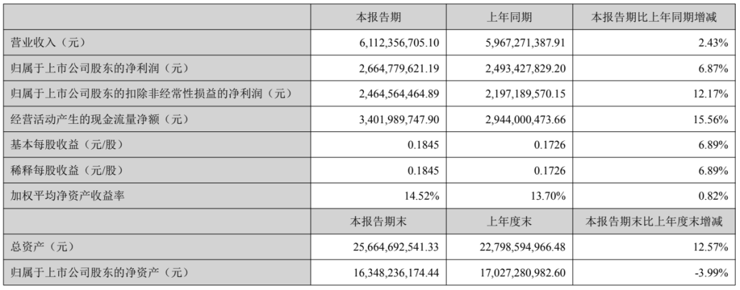 2025年上半年,公司实现营业收入61.12亿元,同比增长2.43%;归母净利润为26.65亿元,同比增长6.87%,经营业绩保持平稳增长。