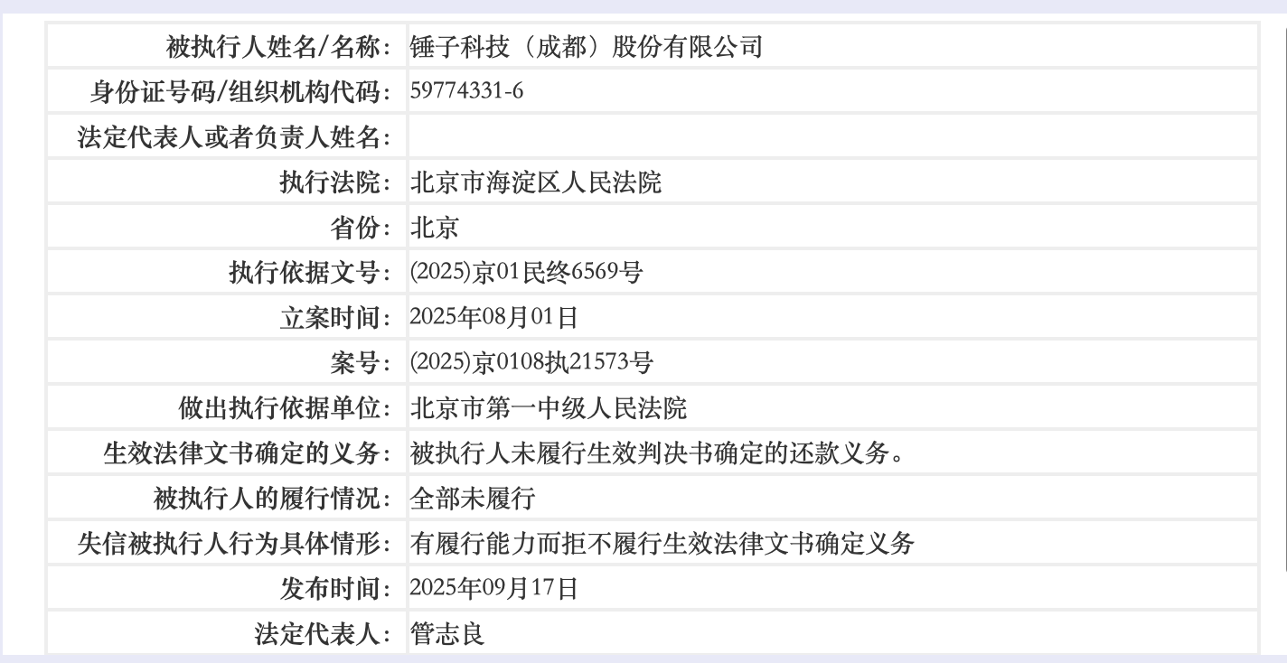 中国执行信息公开网9月17日发布内容显示,锤子科技(成都)股份有限公司新增两条失信被执行人信息,均涉及与苏州紫辉盛网创业投资企业(有限合伙)相关借款合同纠纷案件,履行情况为全部未履行,执行法院为北京市海淀区人民法院。