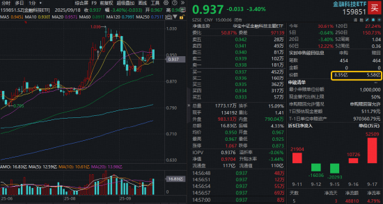 热门ETF方面,同类规模超百亿、流动性断层之一的金融科技ETF(159851)午后跌幅扩大,场内收跌3.4%失守两根均线,全天小幅缩量成交16.83亿元。资金继续布局金融科技板块,159851单日再获净申购2.77亿份,此前两日已累计吸金超6亿元。