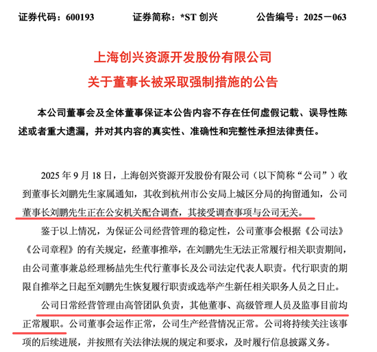 9月18日晚,*ST创兴(600193)公告, 收到公司董事长刘鹏家属通知,其收到杭州市公安局上城区分局的拘留通知,刘鹏因配合公安机关调查被采取强制措施,其接受调查事项与公司无关。
