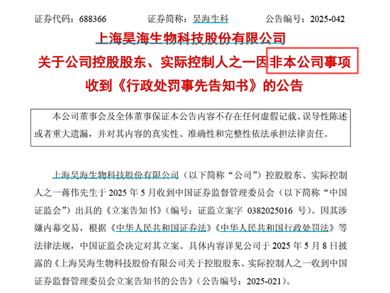9月16日晚,昊海生科公告称实控人蒋伟已收到中国 *** 出具的《行政处罚事先告知书》,并再次强调处罚“所涉主体为蒋伟先生个人,与公司无关。”