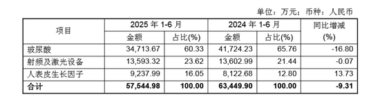 其中,作为其重要增长引擎的医疗美容与创面护理产品,今年上半年收入5.75亿元,同比下降9.31%。曾给其创造巨大利润的玻尿酸收入骤降,是导致引擎“熄火”的重要原因。