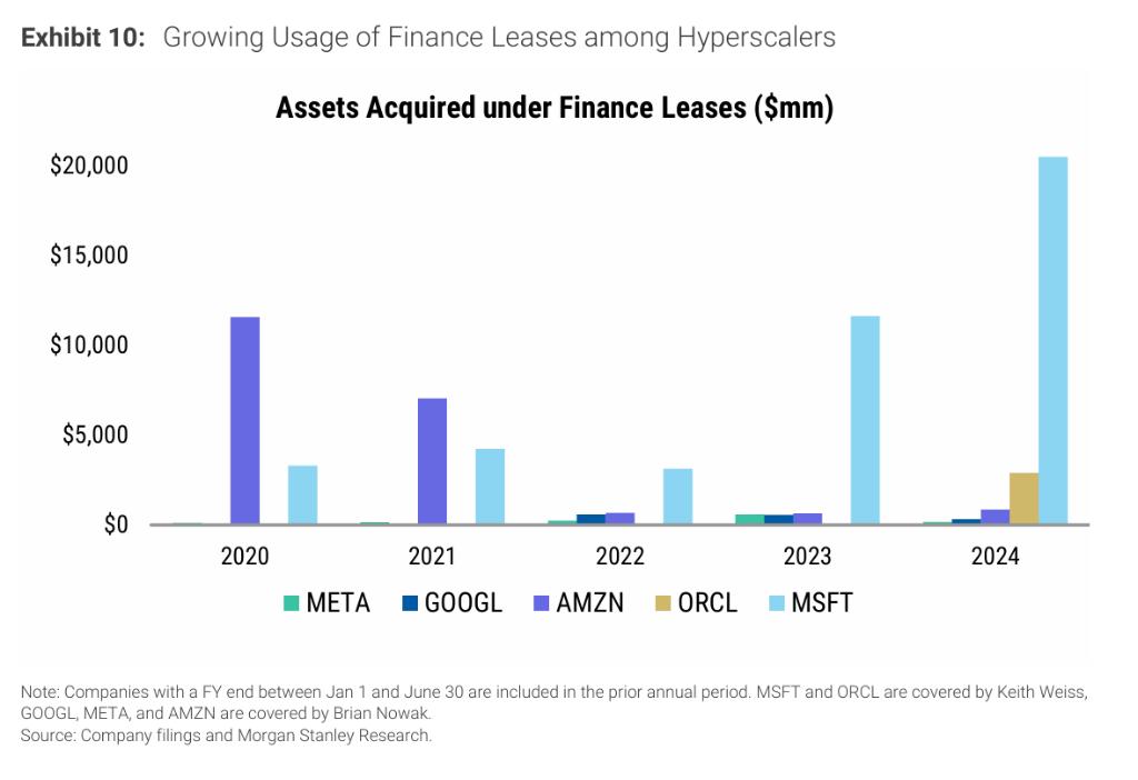 首先,是融资租赁的崛起。微软和甲骨文等公司正越来越多地使用融资租赁来建设数据中心。这种方式在经济实质上类似于举债购买资产,但其初始投资通常不计入传统的资本支出,从而绕过了现金流量表。报告发现,微软和甲骨文的资本密集度在计入融资租赁后显著跃升。例如,根据摩根士丹利的估算,微软2026财年的资本支出与销售额之比将从28%跃升至38%,而甲骨文则从41%飙升至58%。此外,这些巨头已签约但尚未开始的租赁承诺金额已超过3350亿美元,预示着这一趋势还将持续。