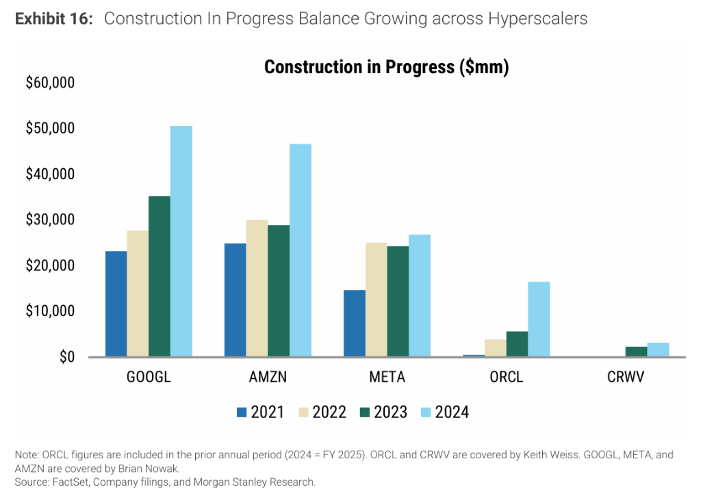 其次,是“在建工程”的延迟效应:巨额投资正以“在建工程(Construction in Progress, CIP)”的形式沉淀在资产负债表上。这些资产在正式投入使用前不会计提折旧,因此其成本尚未对利润表产生影响。摩根士丹利的数据显示,谷歌、亚马逊、Meta和甲骨文的在建工程余额在过去一年中均出现急剧增长,例如亚马逊增长了约60%(170亿美元),谷歌增长了约40%(150亿美元)。这意味着,大量资本已经支出,但其对盈利的冲击才刚刚开始。